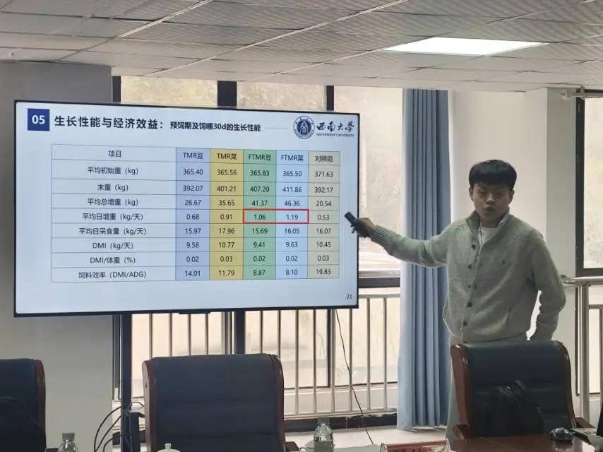 西南大学博士研究生杜家华汇报了“贵州菜籽饼FTMR生产性能与效益评估”研究,分享了降本增效的科学饲养方法。平渊董事长强调,实验数据需精准反映养殖成本与利润,为产业决策提供支撑。