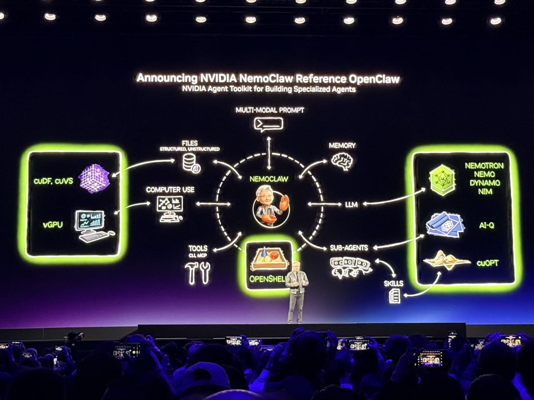 智能体需要各种Skills。其中NVIDIA OpenShell是一款面向智能体的新型开源安全与防护运行时,提供了“龙虾”缺失的基础设施层,通过基于策略的安全、网络和隐私护栏进行管控。AI-Q是一个开源蓝图,融合前沿模型与开放模型的智能,打造全球领先的面向长期工作流的研究型智能体,且运行高效。