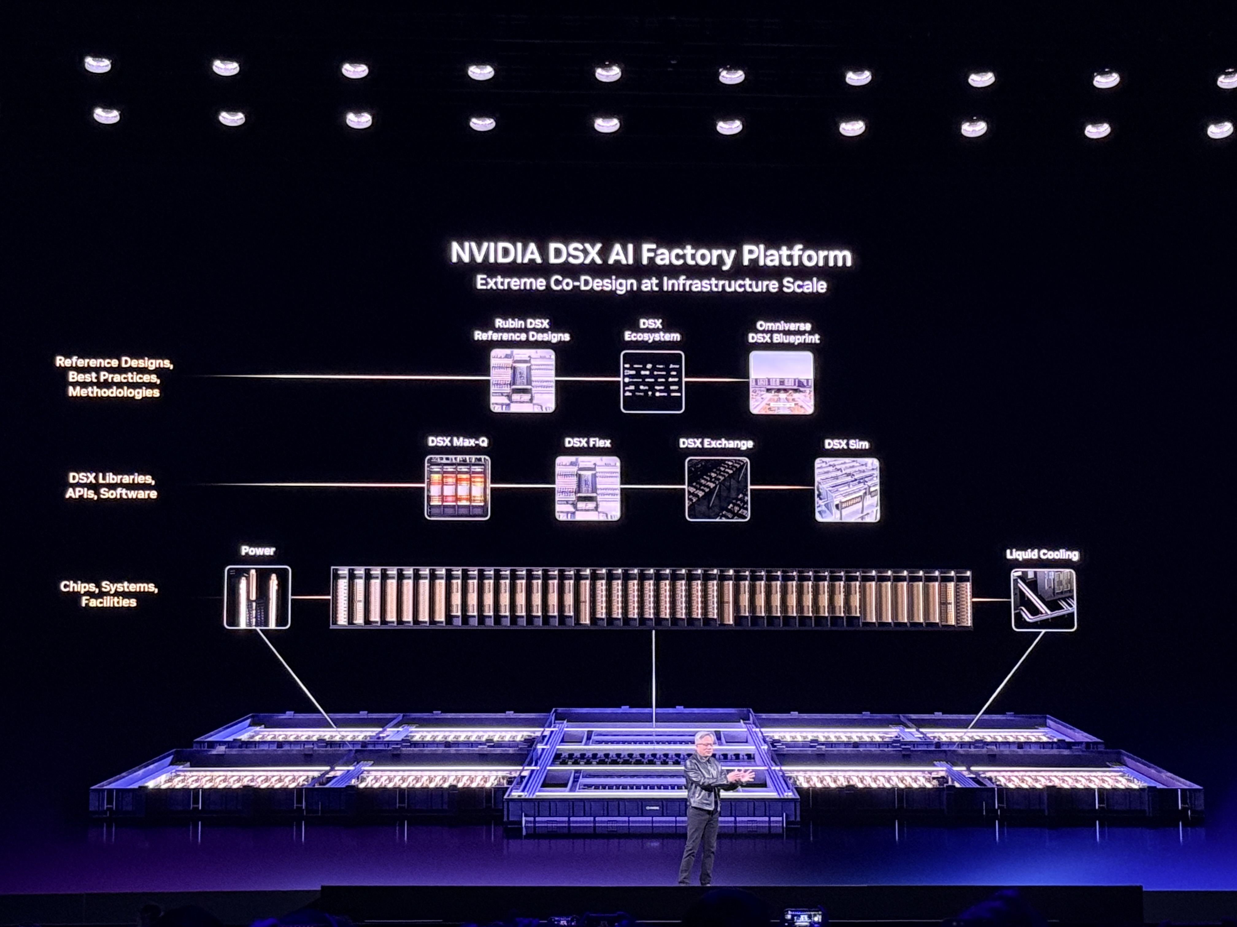 Vera Rubin DSX AI工厂参考设计,这是一个AI基础设施蓝图,概述了如何设计、构建、操作整个AI工厂基础设施堆栈,可最大限度提高每瓦token和整体实际吞吐量,提高系统弹性并加快首次生产的时间。基于Rubin平台部署DSX架构后,AI工厂能在固定功耗下,实现能效比提升