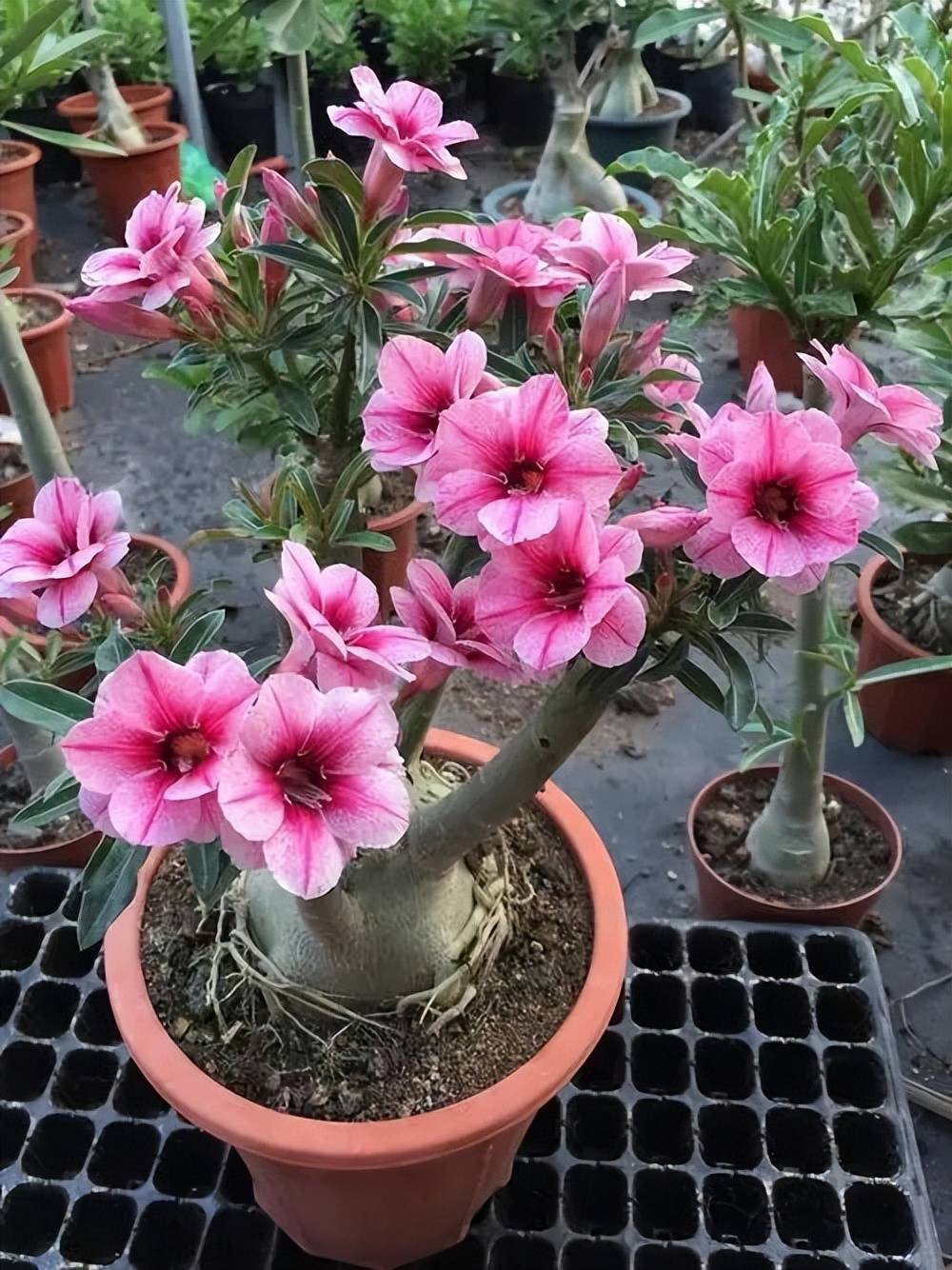 沙漠玫瑰的茎秆粗壮,这种花卉是很耐旱的,对水分的需求不是很大,所以千万不要经常浇水,浇水过多还会积水烂根。需要注意的是,在生长期多晒晒太阳,最主要的是,在开花之前,追加一些磷钾肥,对开花也是很有帮助的。