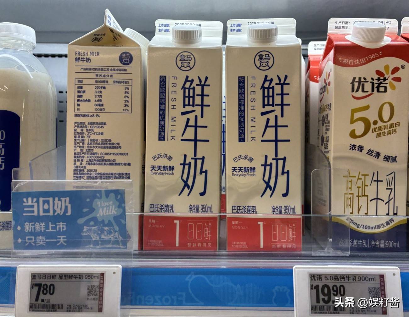 这还不是最夸张的情况。在京东七鲜超市,一款自有品牌的4.0克乳蛋白有机纯牛奶,10盒一箱只卖29.9元。沃尔玛的自有品牌沃集鲜4.0纯牛奶,1升装卖9.9元,另一款3.3克乳蛋白的同样规格产品,售价仅为7.99元。伊利给永辉超市代工的950毫升鲜牛乳,也只卖7.9元。要知道,950毫升差不多是一公斤的量,这个价格比很多饮料都便宜。三元给盒马定制的日日鲜牛奶,950毫升规格同样只卖7.8元。头部乳企通过为商超代工来盘活闲置产能,同时也能稳定与核心零售渠道的合作关系,这成了行业下行周期里的无奈选择。