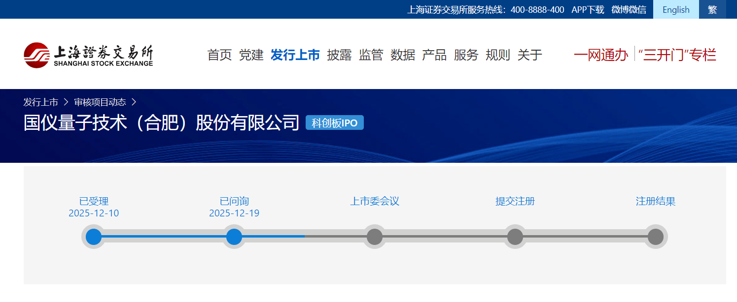 国仪量子IPO申请于2025年12月10日获受理,按照常规上市审核流程,预计最快1月中旬上交所将进行首轮问询。