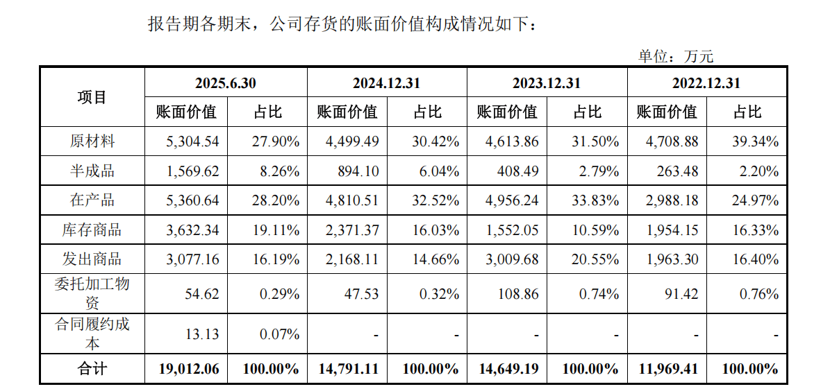 另一方面,公司存货的账面价值不断增加,报告期各期末,公司存货账面价值分别为11,969.41万元、14,649.19万元、14,791.11万元和19,012.06万元,占流动资产比例分别为23.69%、23.09%、16.50%和26.29%。公司存货主要包括原材料、半成品、在产品、库存商品和发出商品。