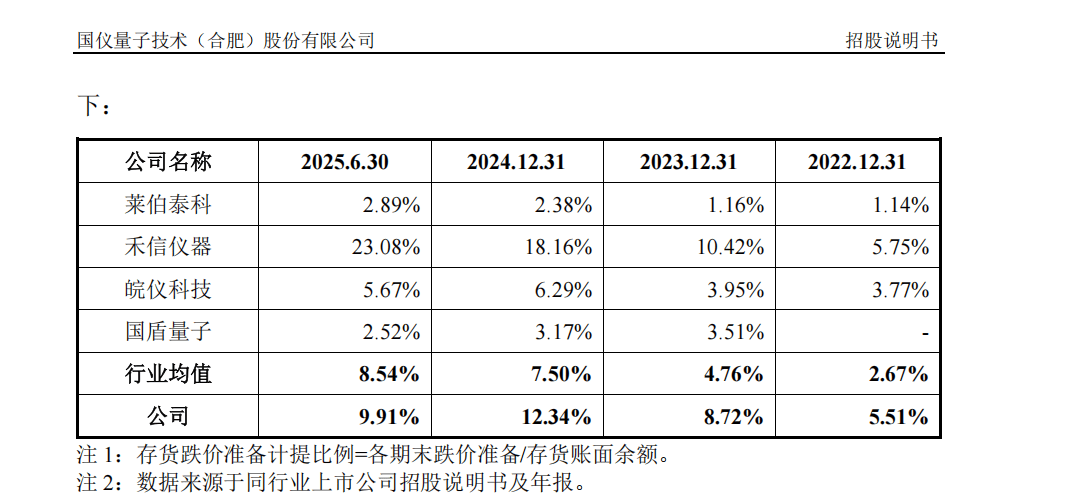 报告期各期末,公司存货跌价准备计提金额分别为697.52万元、1,399.05万元、2,082.15万元和2,091.24万元,占存货账面余额的比例分别为5.51%、8.72%、12.34%、9.91%,整体呈现上升趋势,且需要注意的是,国仪量子的存货跌价计提比例高于同行均值,各期分别为5.51%、8.72%、12.34%、9.91%,同行业可比公司的均值分别为2.67%、4.76%、7.50%、8.54%。