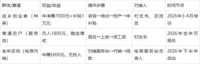 (2025-2026年),咱农民当下要做的:找村支书咨询本地可参与的赛道,报名3-4月的农技培训,符合条件的抓紧申报创业补贴,抢占红利期。