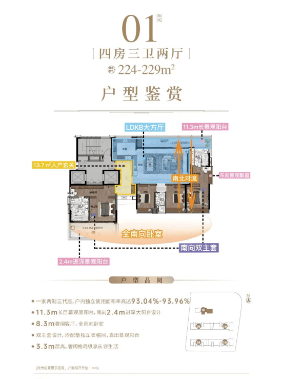 户型方面,最小面积130平方米三房,最大面积224-229平方米四房,只有两种户型,但每一种都做得非常精致。值得一提的是,小高层8楼以下是旧规,8楼以上是新规。新规产品的使用率更高,这一点在交付后会让业主感受到实实在在的实惠。