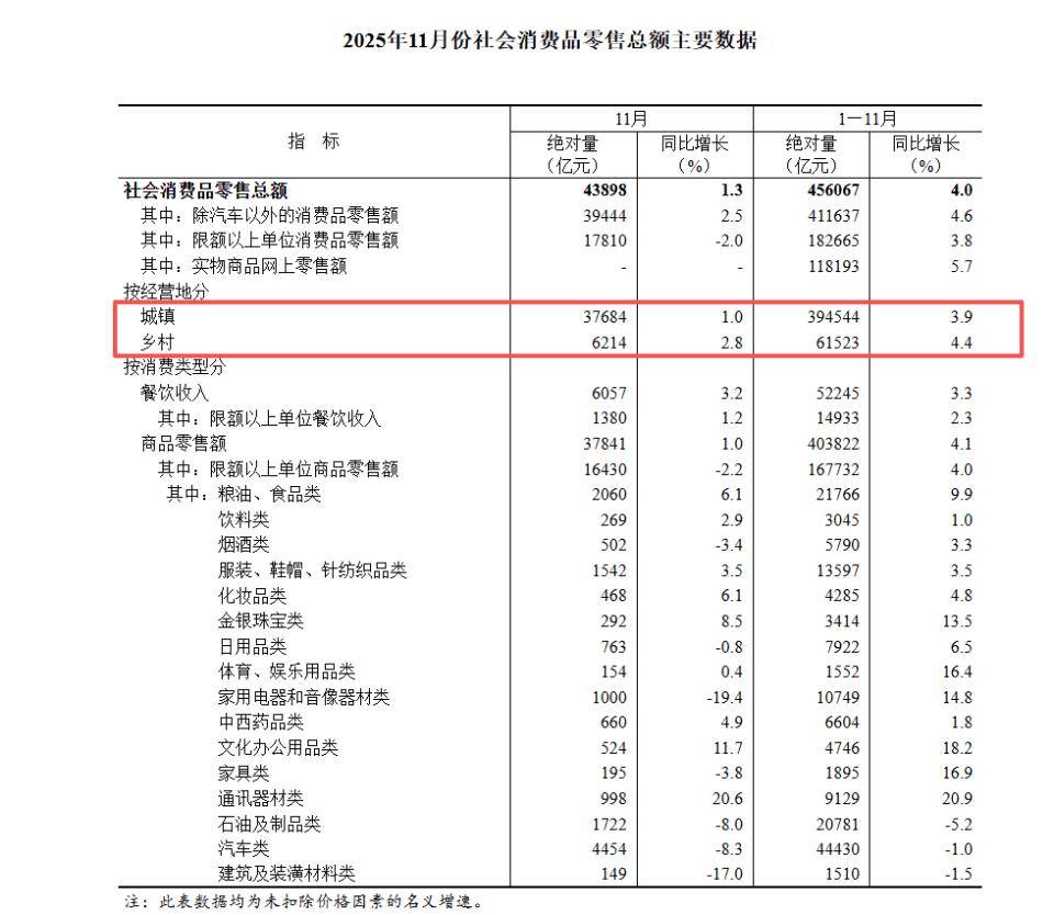 国家统计局公布:2025年1-11月社零总额同比增长4.0%;其中乡村社零同比增长4.4%,快于城镇的3.9%。